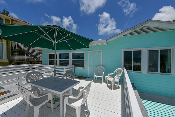 This is our largest beach-front unit featuring 3 bedrooms. Two have queen beds, while the third has 2 twin beds. The beach rental unit also features a nicely furnished living/dining room, kitchen, full bath, large enclosed porch, and a fabulous outside sun deck.
